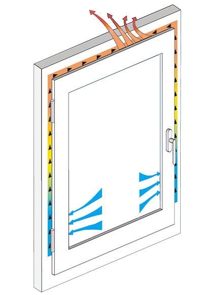 Vom Lufteintritt bis zum Einströmen der frischen Luft in den Raum wird diese bei niedrigen Außentemperaturen im Fensterfalz über 10 °C vorerwärmt. Die Luft tritt im oberen Bereich des Fensters ins Rauminnere und vermischt sich direkt mit der warmen Raumluft.